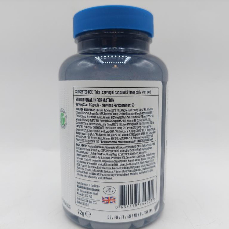 این مکمل اپلاید نوتریشن حاوی بیش از 30 ویتامین، مواد معدنی، پروبیوتیک ها و آنتی اکسیدان ها است و دارای پوسته گیاهی می باشد.