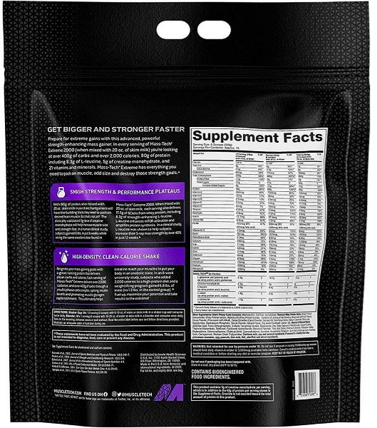 همچنین MASS-TECH® EXTREME 2000 بیش از 2000 کیلو کالری (در صورت مخلوط شدن با 600 میلی لیتر شیر بدون چربی) فراهم می کند که از پروتئین وی با کیفیت بالا و کربوهیدرات های پیچیده به راحتی قابل هضم به دست می آید.